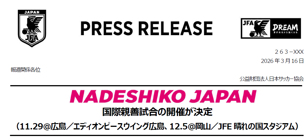 NADESHIKO JAPAN 国際親善試合の開催が決定 2026 3/16 お知らせ全て 2026年3月16日 11.29@広島/エディオンピースウイング広島 PRESS RELEASE お知らせ全て よかったらシェアしてね! URLをコピーしました! URLをコピーしました! 関連記事 キリンチャレンジカップ2026 9月28日(月)@広島/エディオンピースウイング広島 2026年3月16日 2025年度リフレッシュ講習会 2026年3月5日 2026年度フットサル4級 2026年3月5日 2026年度フットサル3級昇級 2026年3月5日 JFAキッズサッカーフェスティバル IN 福山 2026年3月5日 「JFA 女子サッカーデー」 2026年3月2日 2025年度 リフレッシュ講習会 2026年2月26日 2025年度リフレッシュ研修会 2026年2月3日